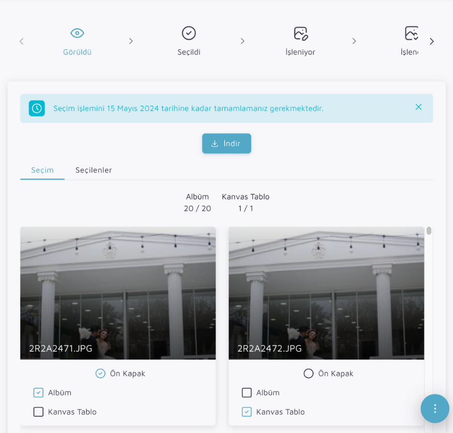 Evet, PickPhotos hem size hem de müşterilerinize albümün değişen durumlarıyla ilgili bilgilendirme e-postaları gönderir. Aynı zamanda panelinizden albümün güncel durumunu takip edebilirsiniz. Örneğin müşteriniz seçimini tamamladıktan sonra albümün güncel durumu "seçildi" olarak değişir ve buna dair size PickPhotos tarafından bilgilendirme e-postası iletilir.